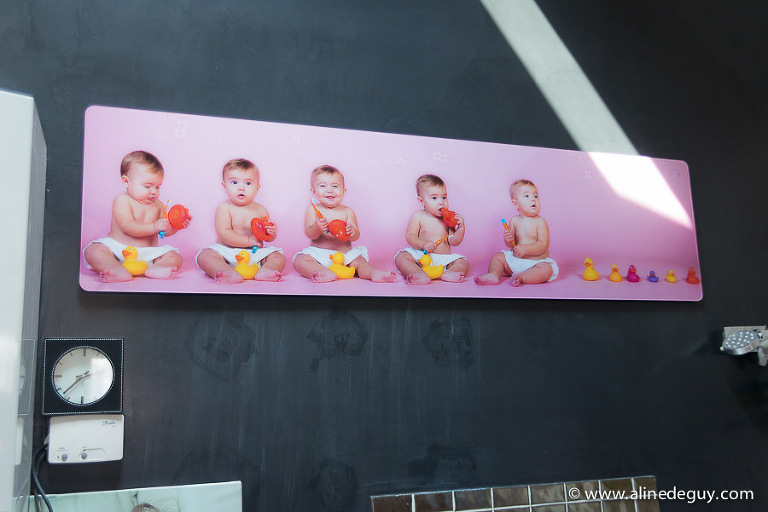 J’adore ses photos et la toile ds la salle de bain, une super idée