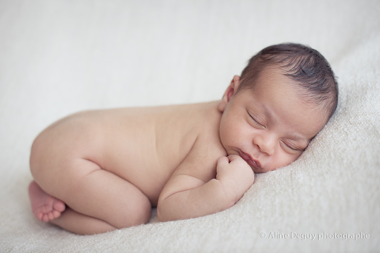 Un bébé extrêmement calme, qui a bien dormi, apaisé.  Une séance photo exemplaire.