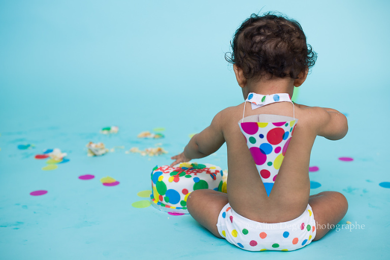 Nous avons terminé le shooting par un « smash the cake ». La tendance, venue tout droit des US : présenter un joli gâteau à bébé et le laisser le manger à sa guise.